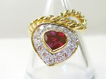 兵庫・川西市・雲雀丘花屋敷のお客様よりハート型にモチーフされた18金の台に、ダイヤモンドとハートシェイプのルビーがセットされた指輪です。