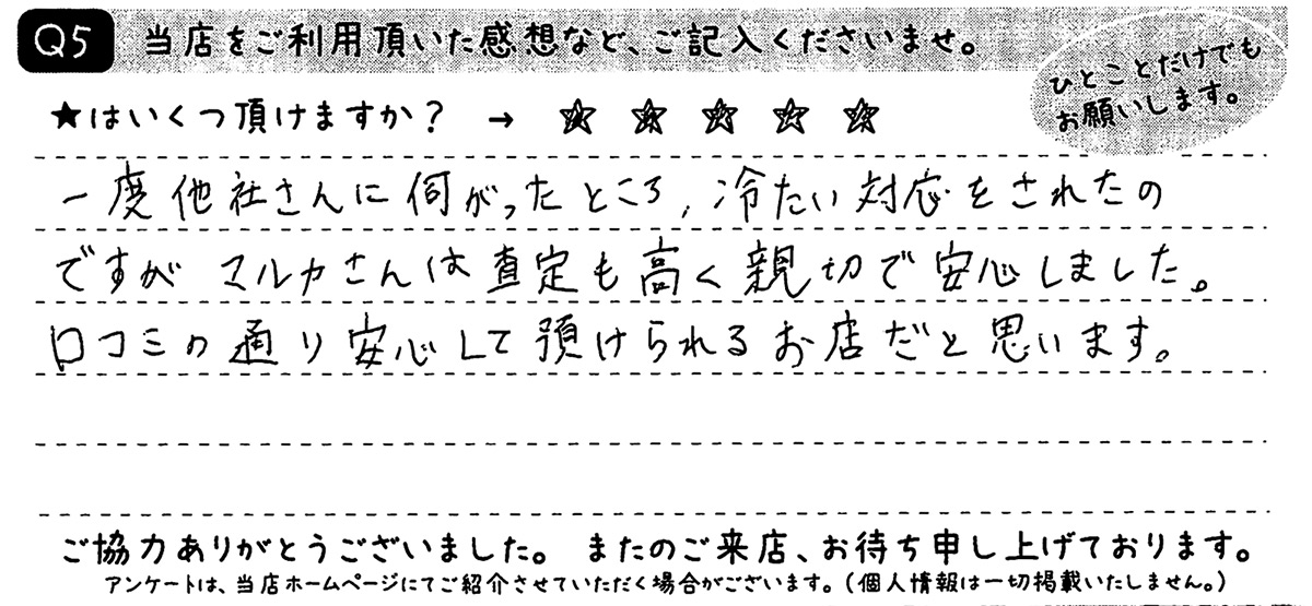 気持ちよくお店を利用して頂けるよう、相場動向や品物についてのお話は致しますが、「今だったら○○○円」「売ってくれないと困る」など面倒な営業トークは一切致しません。