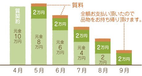 例えば4月に10万円で質預かりをして、毎月2万円+質料を支払えば、5ヶ月で品物をお持ち帰りいただくことができます。(質料が数ヶ月分たまっている場合、金額を減らすたびに質料を全額お支払いください。)
