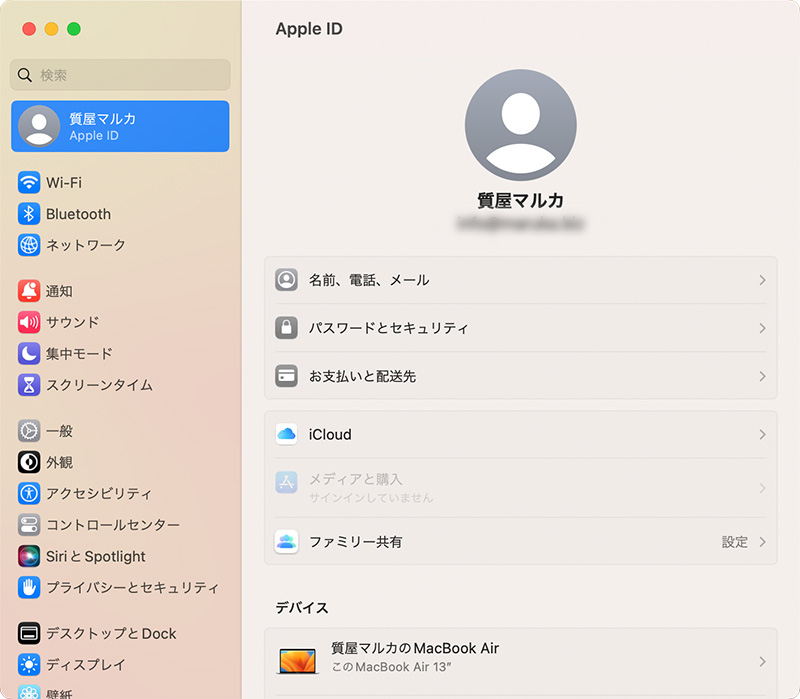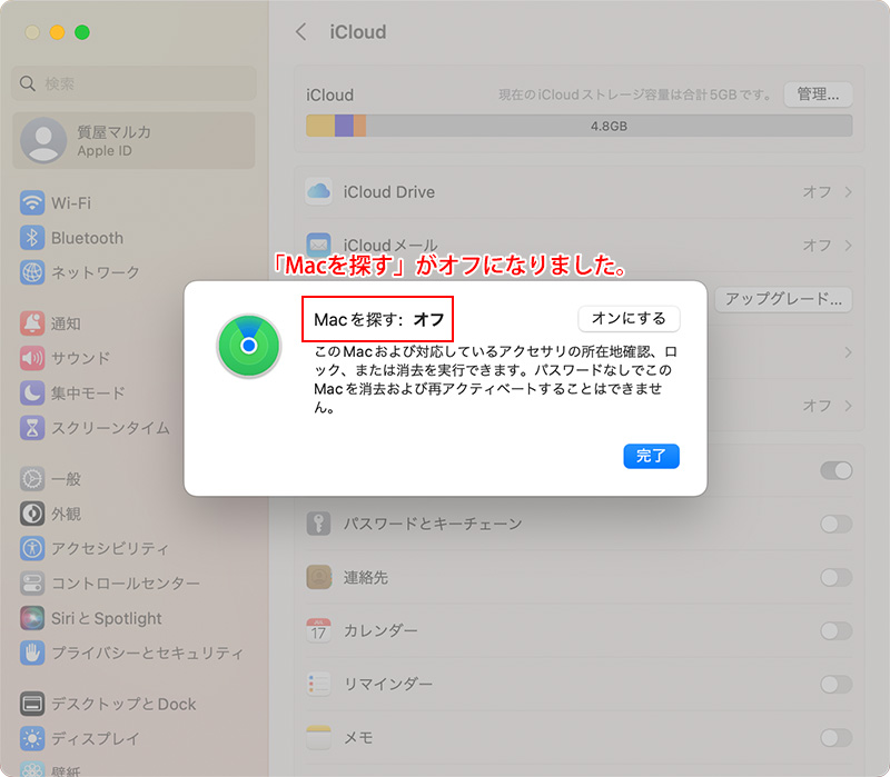 (7)「システム設定」画面に戻ってもう一度「Macを探す」がオフになっていることを確認してください。