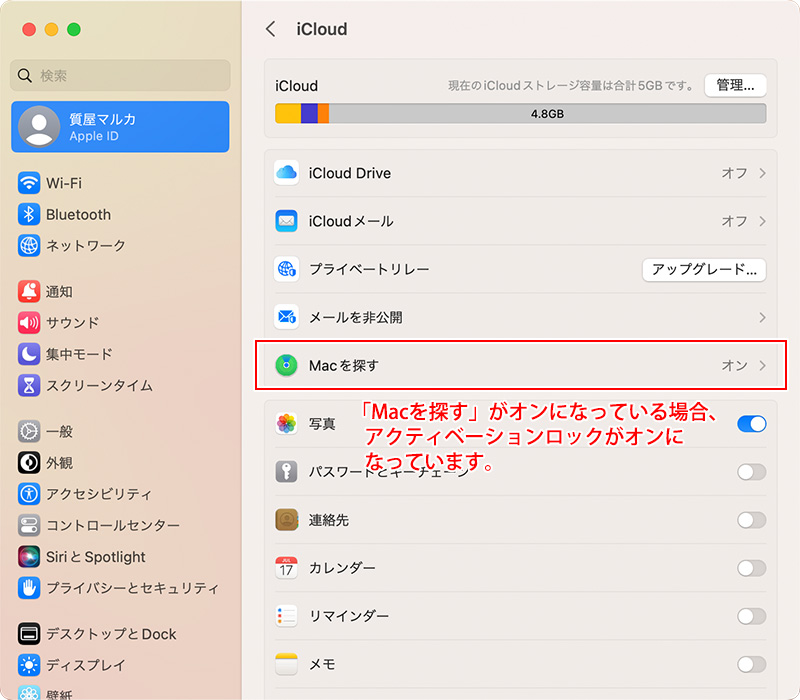 システム設定の「AppleID」>「iCloud」>「Macを探す」がオンになっていれば、アクティベーションロックがかかっています。